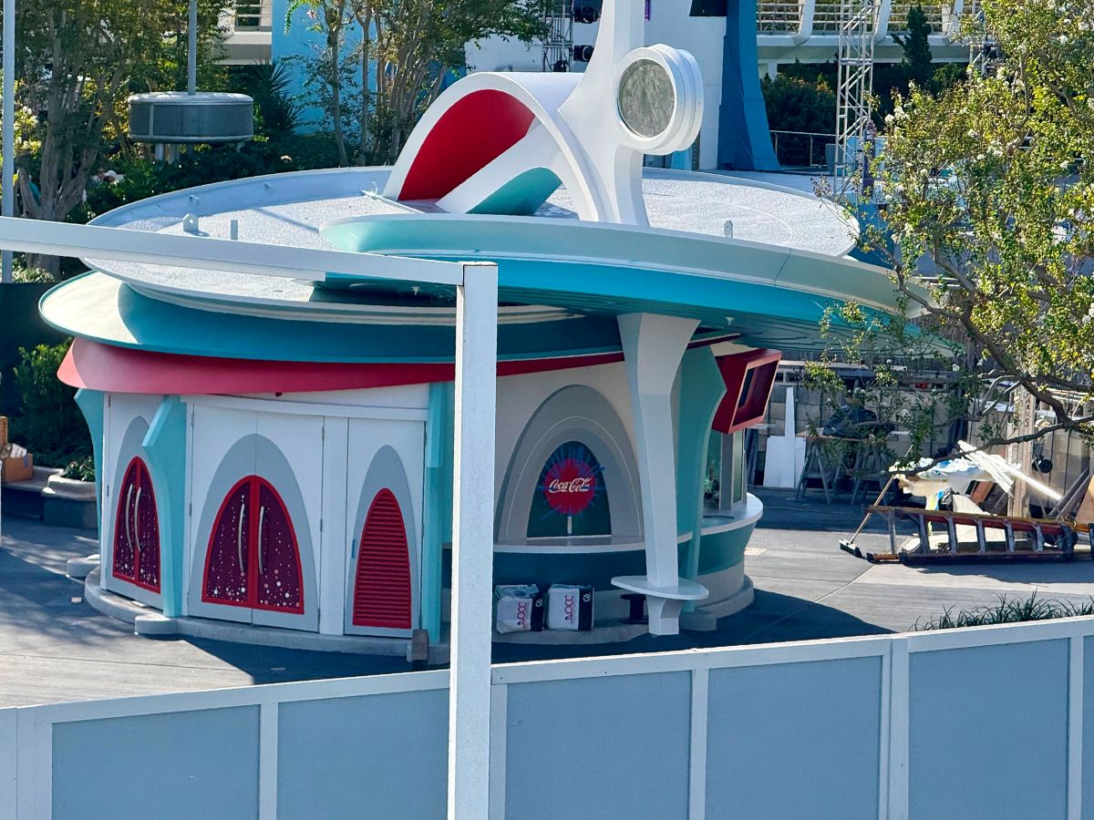 The former Cool Ship kiosk had a design that matched the retro-futuristic theming introduced in Tomorrowland in the ’90s. The steampunk-style supports were a common site around Tomorrowland, but as Disney removed those theming elements, the Cool Ship’s look remained.