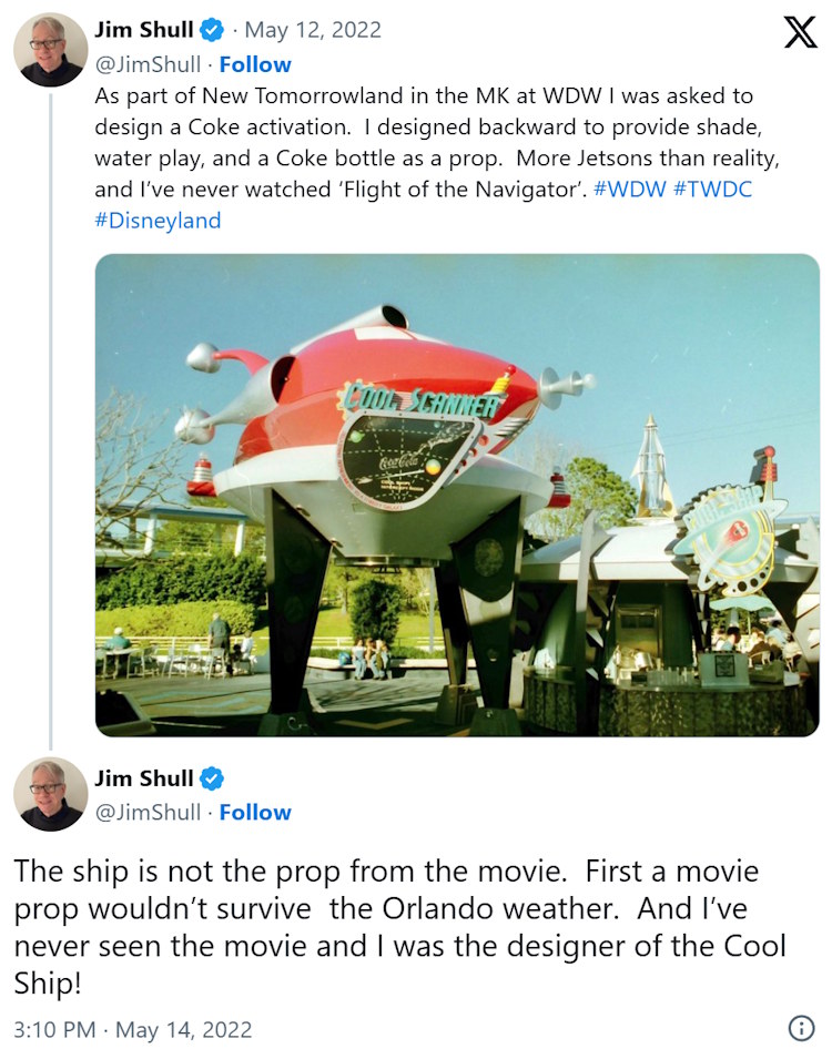 Despite Shull’s statements, many still believe the Flight of the Navigator ship lived on the Cool Ship building. To be fair, the prop from the movie DID live at Disney World for a period of time in the Studio Backlot Tour at Disney’s Hollywood Studios. When the ship disappeared from that attraction, it was easy to assume it moved to a new home on Disney property.